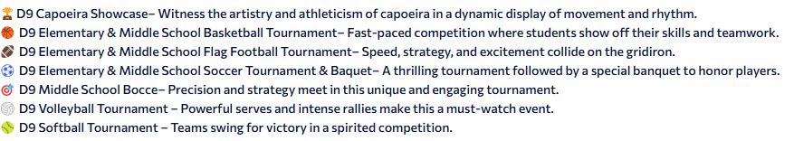 Get ready for an action-packed season of athletic excellence! District 9 is proud to present an exciting lineup of tournaments and showcases that bring together young athletes to compete, grow, and celebrate the spirit of sportsmanship. Whether you're a seasoned player or new to the game, these events are designed to challenge skills, foster teamwork, and create unforgettable moments on the field and court.