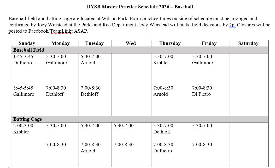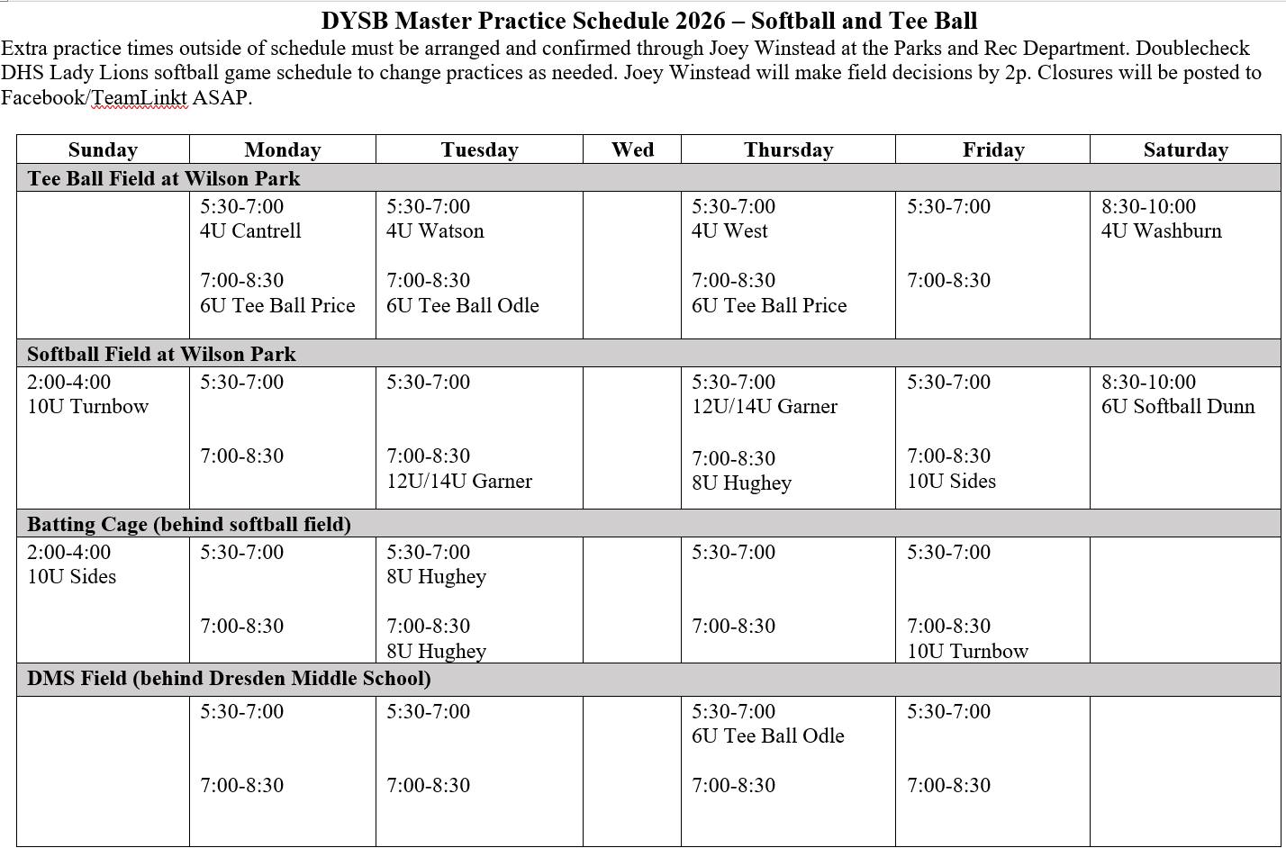 Coaches need to contact Joey Winstead at Dresden Parks and Rec to reserve fields for any additional practice times outside this schedule.