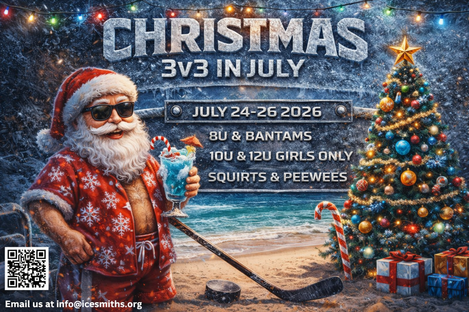 ENJOY ONE ACTION-PACKED DAY OF 3V3 HOCKEY FUN IN A FESTIVE ATMOSPHERE CELEBRATING TEAMWORK, CONFIDENCE, AND COMPETITION. IT’S THE PERFECT WAY TO COOL DOWN AND FIND JOY IN THE MIDDLE OF THE SUMMER. COME FOR THE COMPETITION AND STAY FOR THE MEMORIES AT THE ICESMITHS 3V3 HOLIDAY TOURNAMENT. JOIN US FOR A DAY FILLED WITH HOLIDAY MAGIC ON THE ICE! EACH PLAYER WILL BE PROVIDED FOOD AND DRINK. ADDITIONALLY THERE WILL BE INDIVIDUAL AND TEAM AWARDS FOR THE CHAMPION TEAMS OF EACH DIVISION.