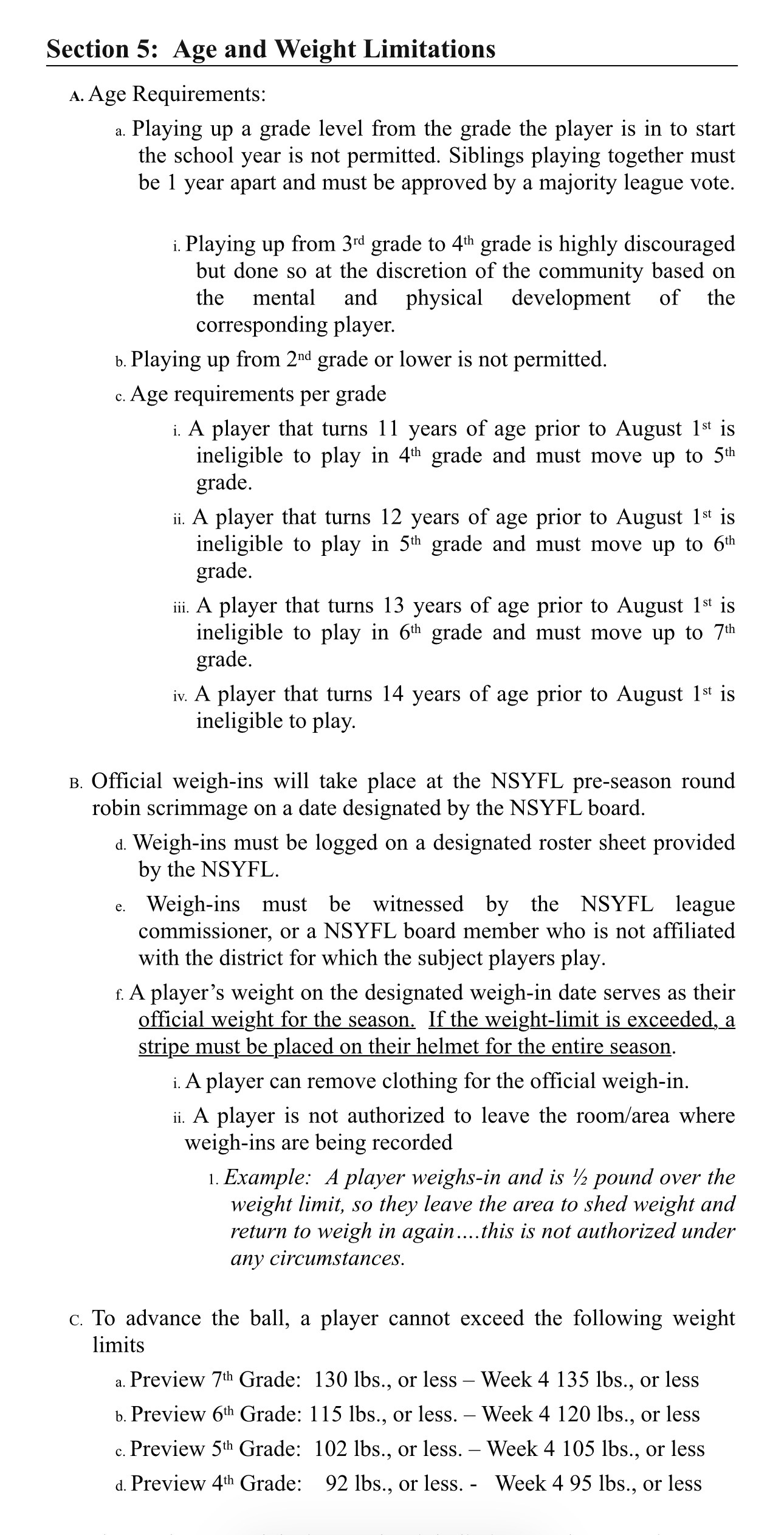 Northern Stark Youth Football League age and weight limitations can be found in the rule book. For a quick reference, see picture below.