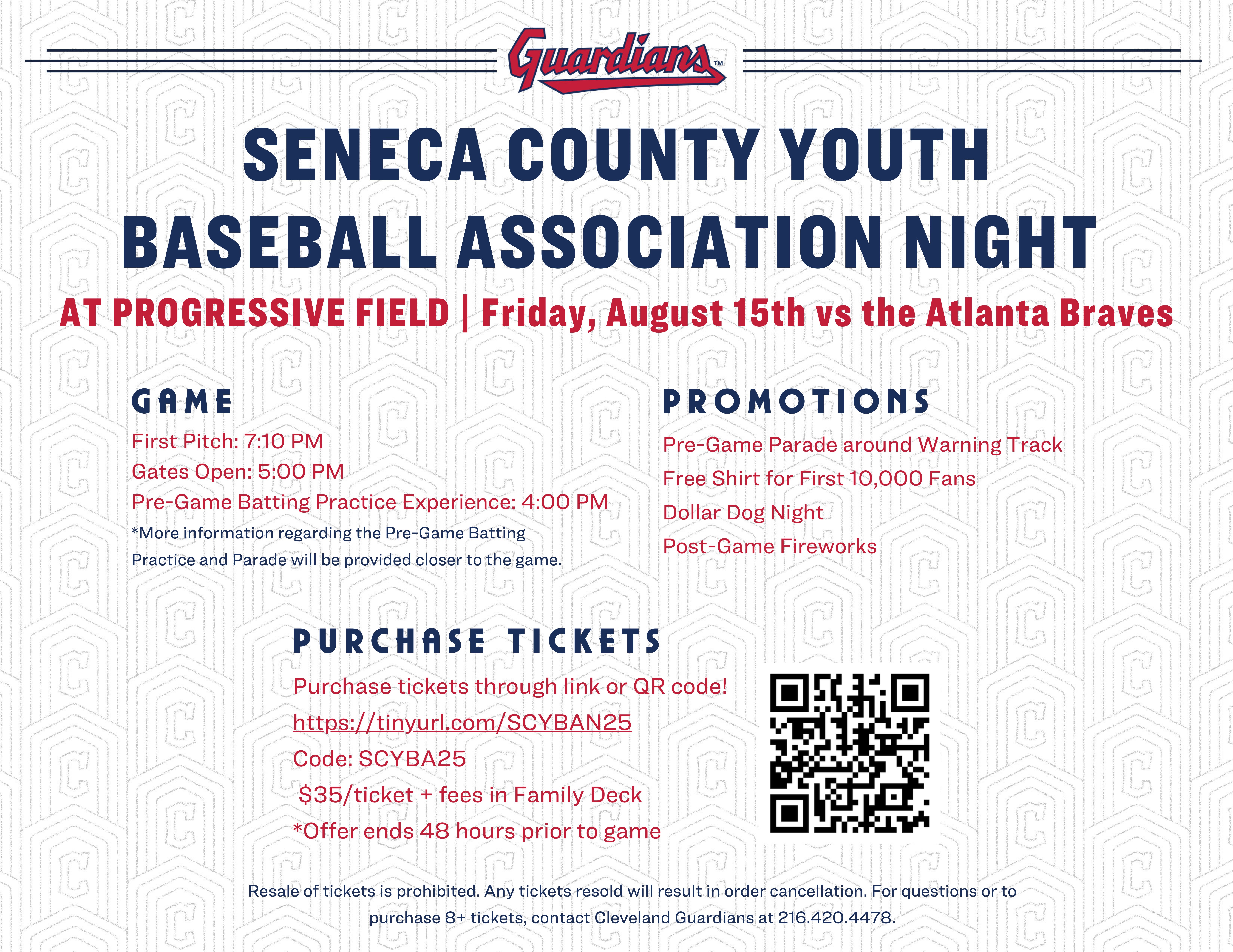 Join us Friday, August 15 as the Cleveland Guardians take on the Atlanta Braves and celebrate Seneca County Youth Baseball Association Night!