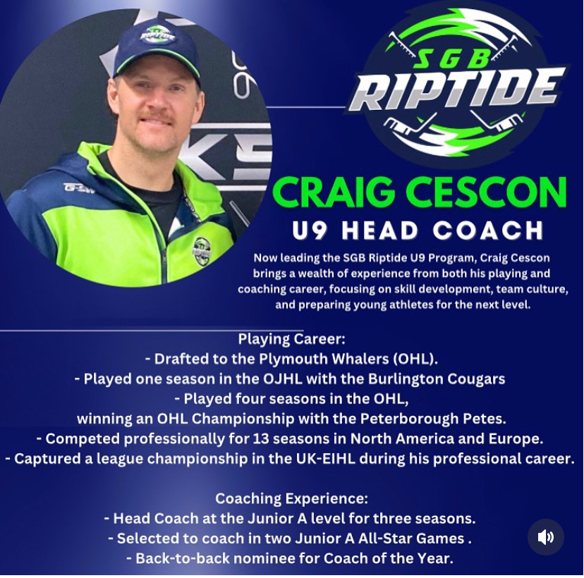 Craig Cescon - Co-owner of SGB Riptide Hockey Craig brings a wealth of hockey experience to the program as a player and coach. The Mississauga, ON native grew up playing his AAA minor hockey in the GTHL. Craig started his Junior career playing 1 season in the OJHL with the Burlington Cougars and the following 4 seasons in OHL with the Plymouth Whalers, Mississauga Ice Dogs and Peterborough Petes. In 2006 Craig and the Petes went on to win an OHL Championship and compete for the Memorial Cup. After Junior Craig made the jump to professional hockey which saw him play 13 seasons in North America and Europe. In 2015, Craig went on to win another championship with the Coventry Blaze of the EIHL. Since completing his final season of professional hockey in 2020, Craig is currently in his 3rd season as a head coach in Junior A Hockey. “We’re passionate about pushing young hockey players to greatness while ensuring they enjoy every moment of the journey. With supportive coaching and a focus on skill development, we inspire our players to reach new heights while having a blast on the ice.” - Craig Cescon